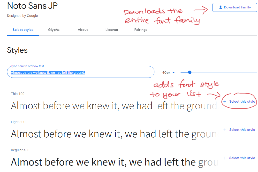Next to each style is a hyperlink-like button that lets you adds the font to a list which we will touch on in a while. What’s important now is that you can just add any of the fonts and styles you wish to use by clicking on the + Select this style button next to the styles. You can also download the entire font family with all the available styles directly, which you can then install on your computer to use.