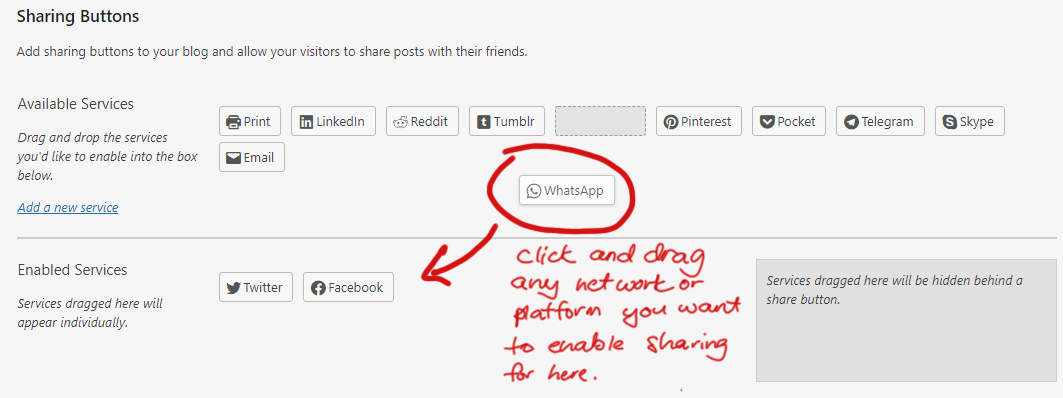 Once enabled, you’ll be able to click on the “Configure your sharing buttons” option right underneath, which will then take you to a new settings page. You can click and drag the available social media platform options to enable them. You can also choose to group up lesser-used platforms under a single share button as to not create clutter. The option to do this lets you display the prominent platforms without drowning them in a sea of icons, but also lets you cover more niche options that may be relevant to your audience.