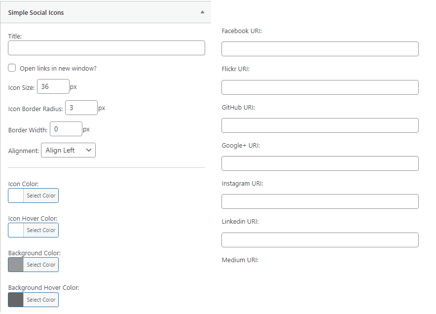 Once enabled, you’ll see the Simple Social Icons widget when you go to your Appearance > Widgets page. Just click and drag the widget to any of your menu/sidebar/footer and you’ll be able to simply enter your social media links.